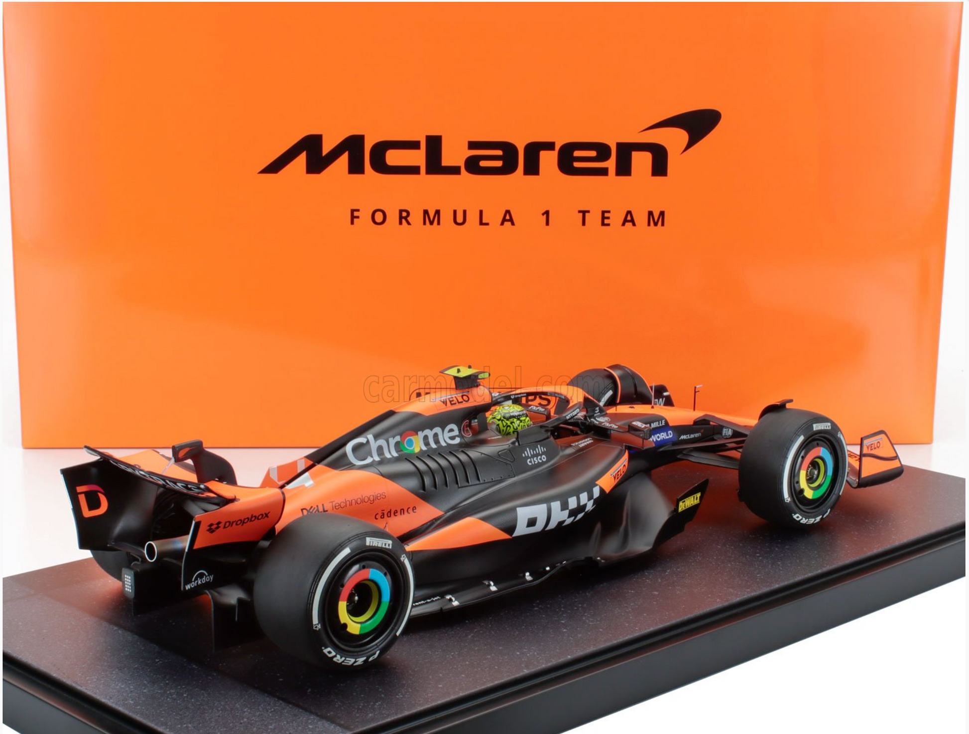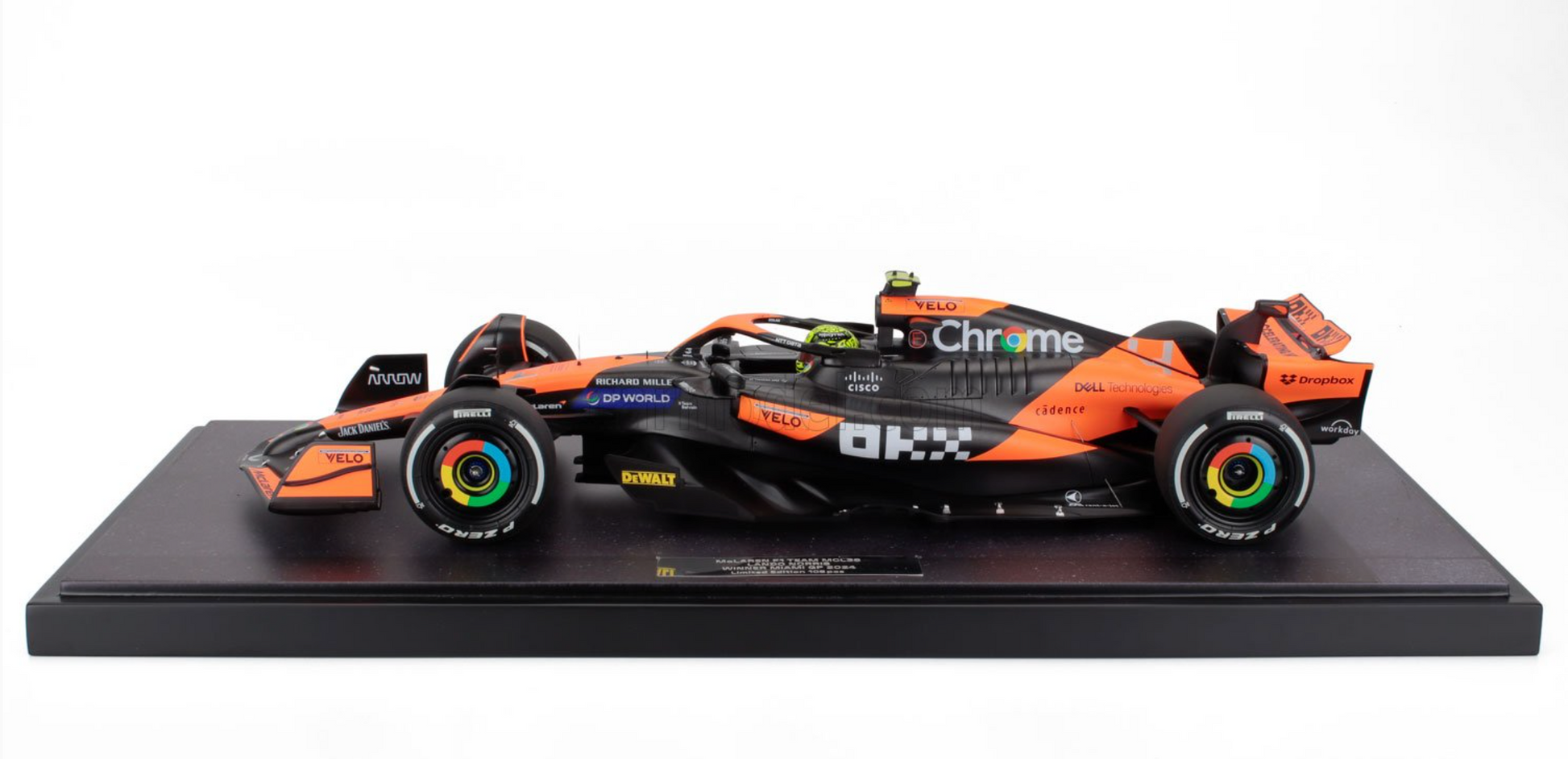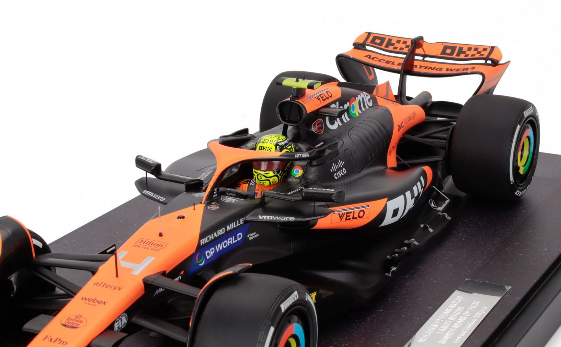 McLaren MCL38 #4 Lando Norris 2024 Miami GP 1/12 Scale Model Car with Display Case by Minichamps. Limited to 108 produced.