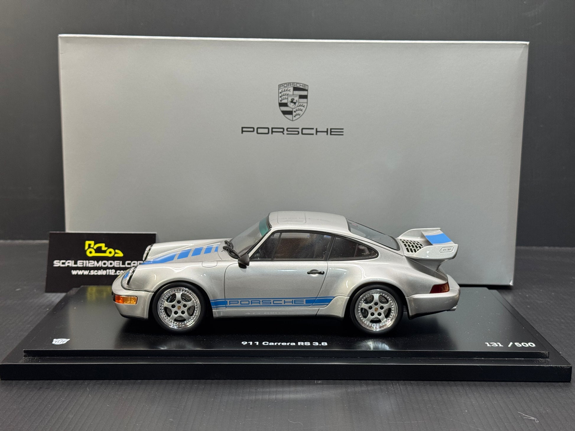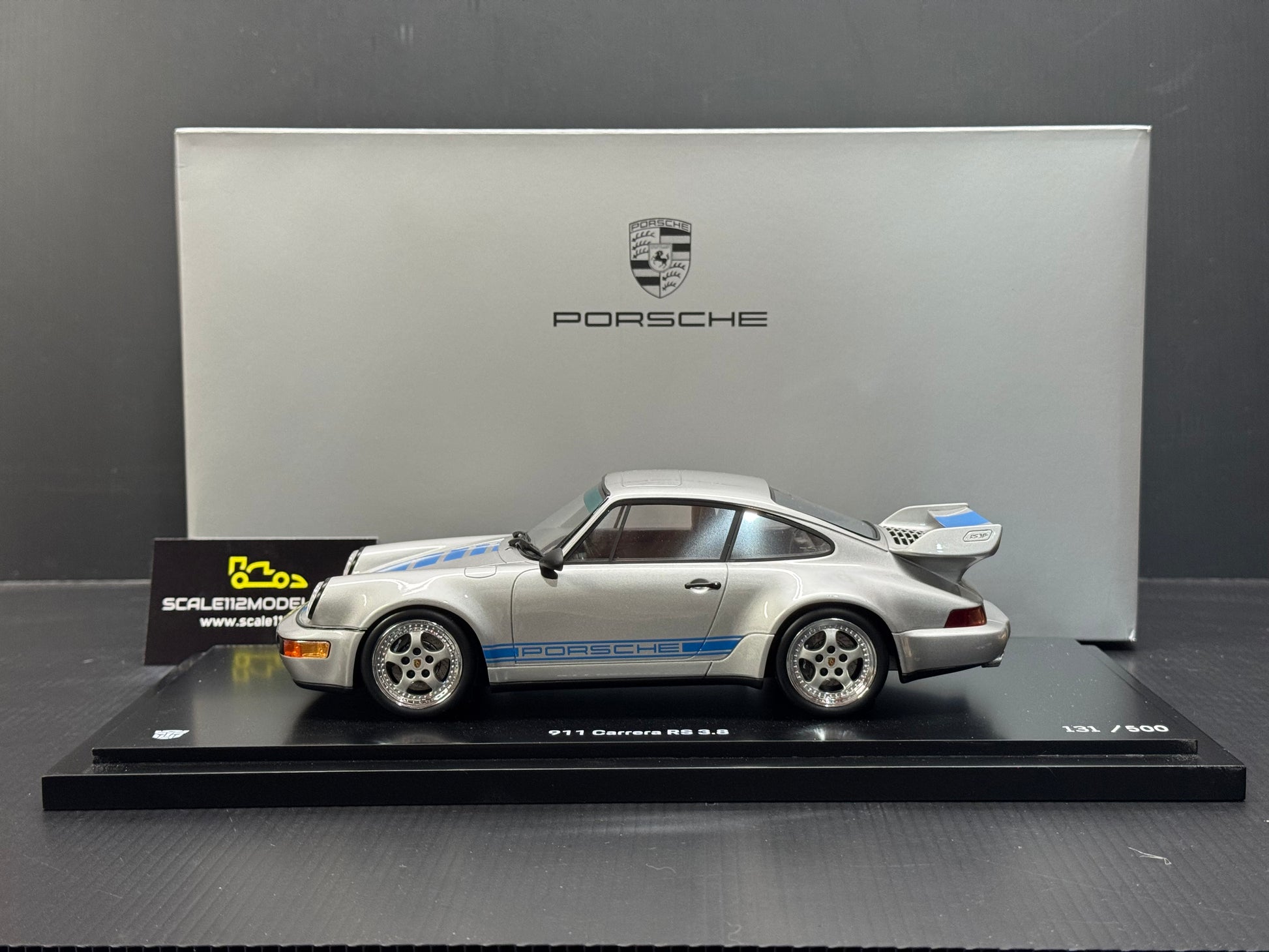 This 1:18 scale model of the Porsche 911 Carrera RS 3.8 964, made by Spark, comes with a stunning display case. The sleek silver color of the car, with its intricate detailing and limited edition status, makes it a must-have for any collector.